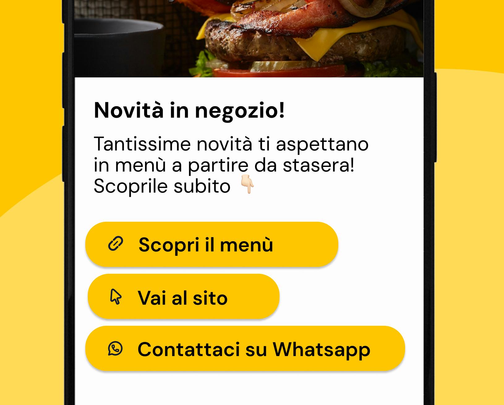 Aggiungi un link al tuo sito, un numero di telefono, il tuo WhatsApp, i tuoi social. Il cliente legge la notifica e con un tocco è già in contatto con te. Non è un volantino che finisce nel cestino. È un messaggio che porta da qualche parte.