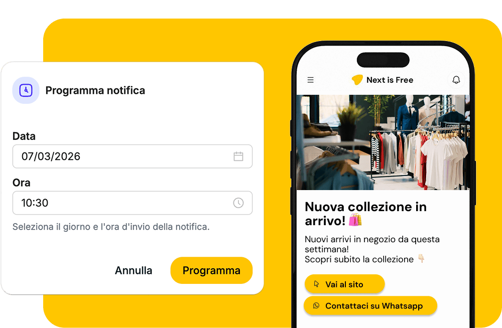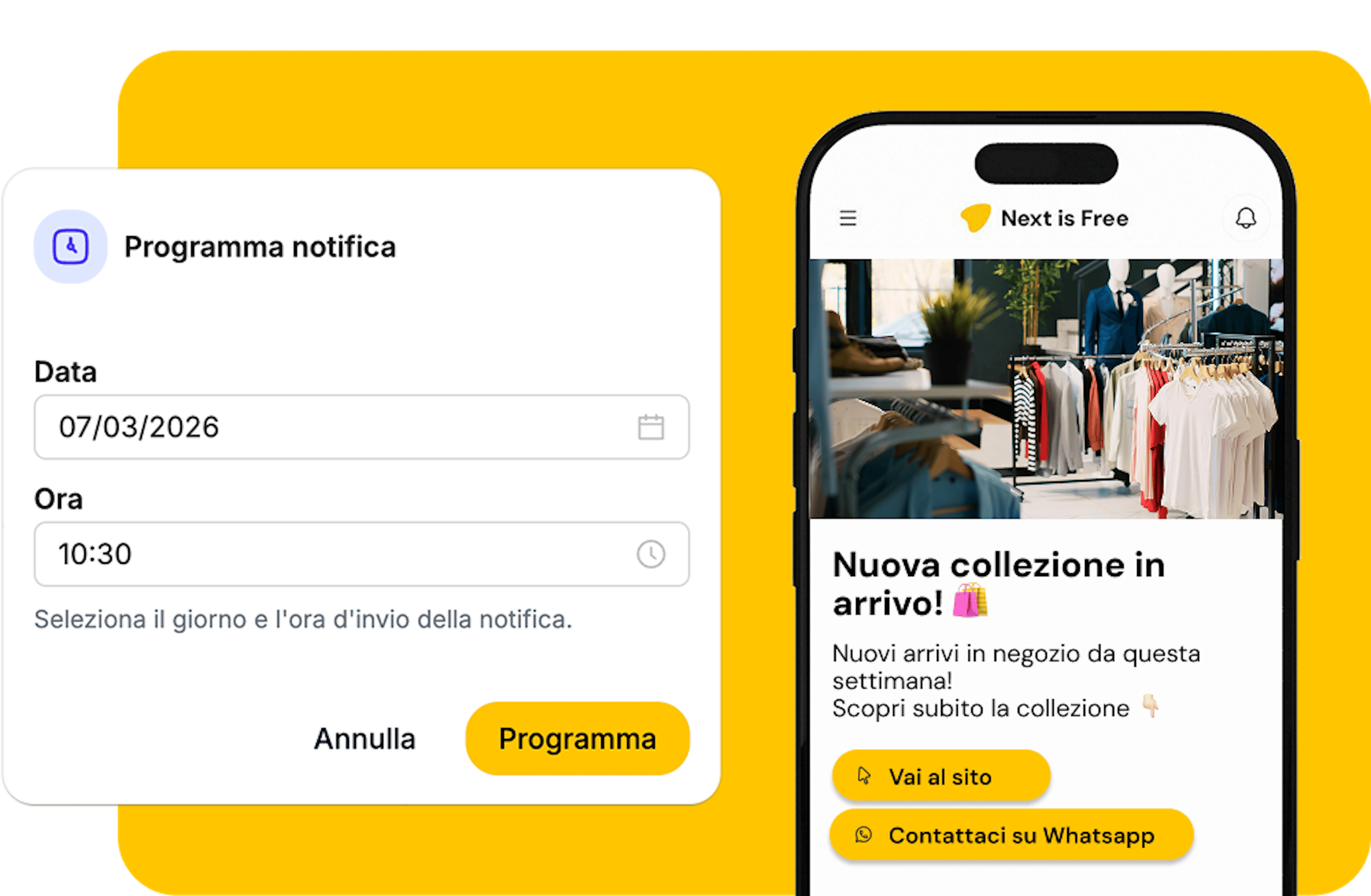Sai che il sabato mattina i tuoi clienti sono più attivi? Programma la notifica il venerdì sera e vai a dormire tranquillo. Next is Free la manda al giorno e all’ora che scegli tu.