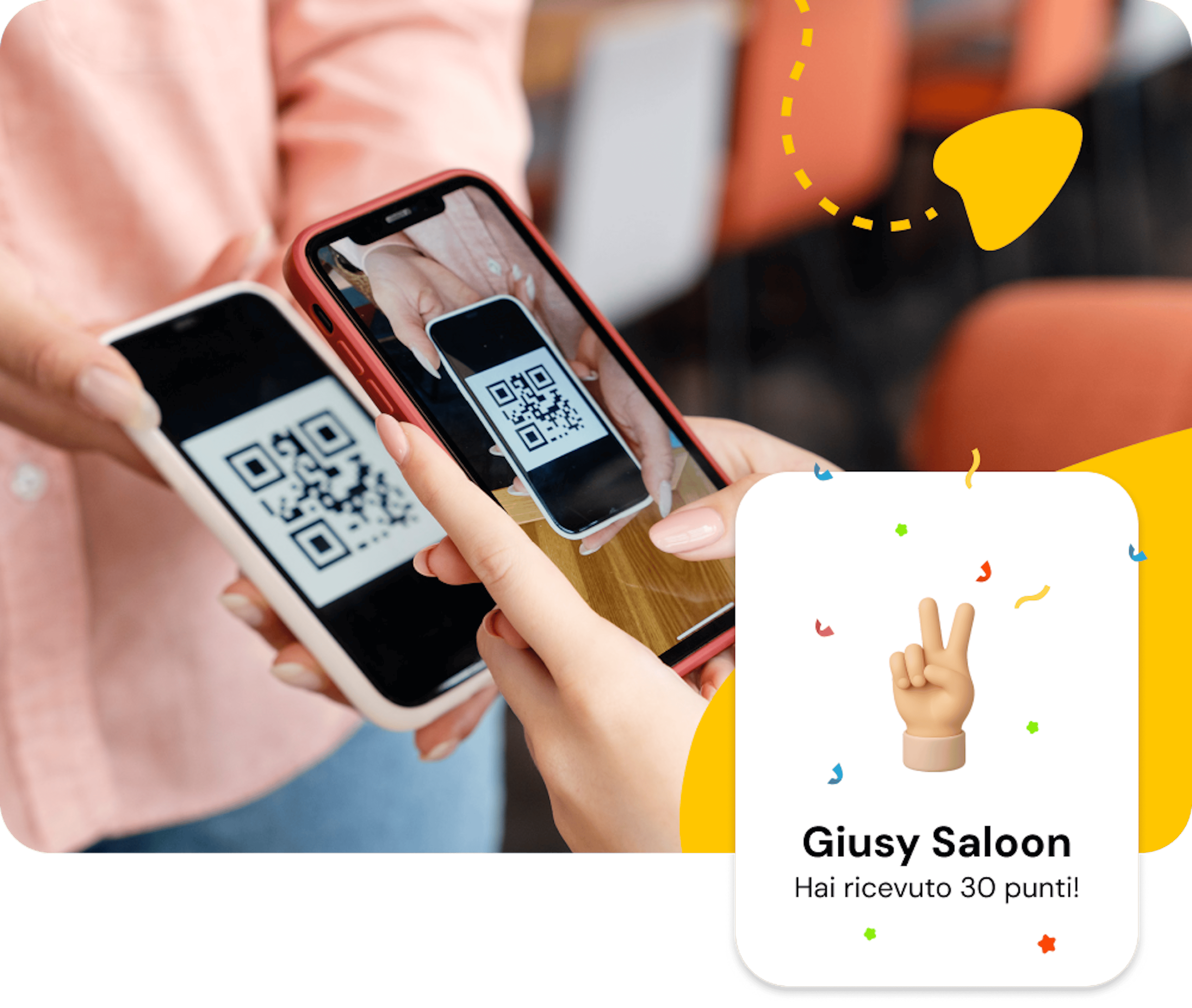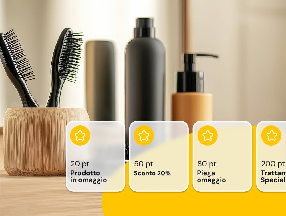 Il cliente paga, tu scansioni il suo QR code, i punti vengono accreditati. Piega, taglio, colore, trattamento, tutto conta. Il cliente vede i punti salire e il prossimo premio avvicinarsi. Non deve ricordare nulla: l'app fa tutto.