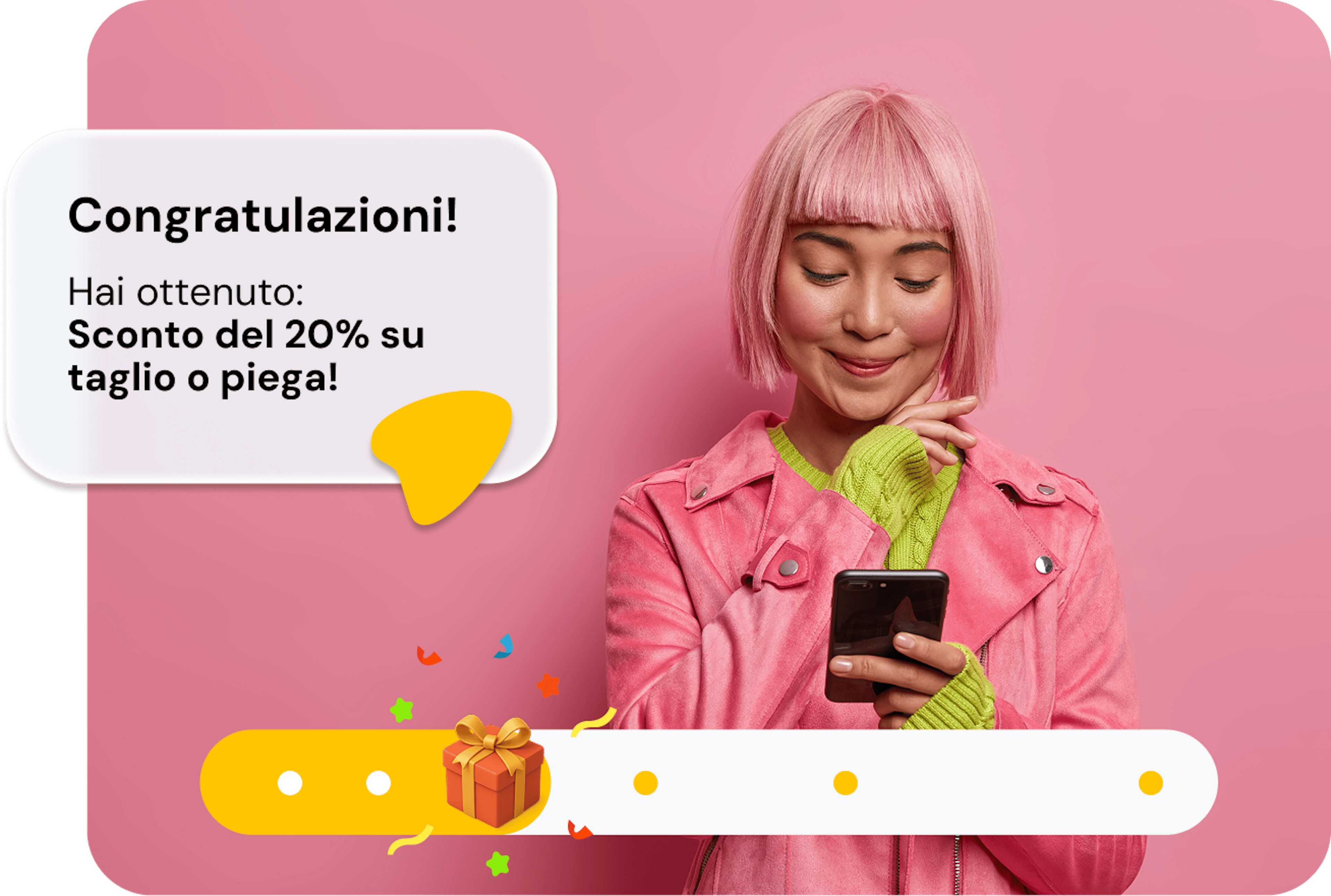 Imposta fino a 4 traguardi con premi personalizzati. Un caffè gratis dopo 10 acquisti? Uno sconto del 20% al cinquantesimo? Decidi tu cosa ha senso per la tua attività. Ogni traguardo è un piccolo motore che tiene il cliente in movimento.