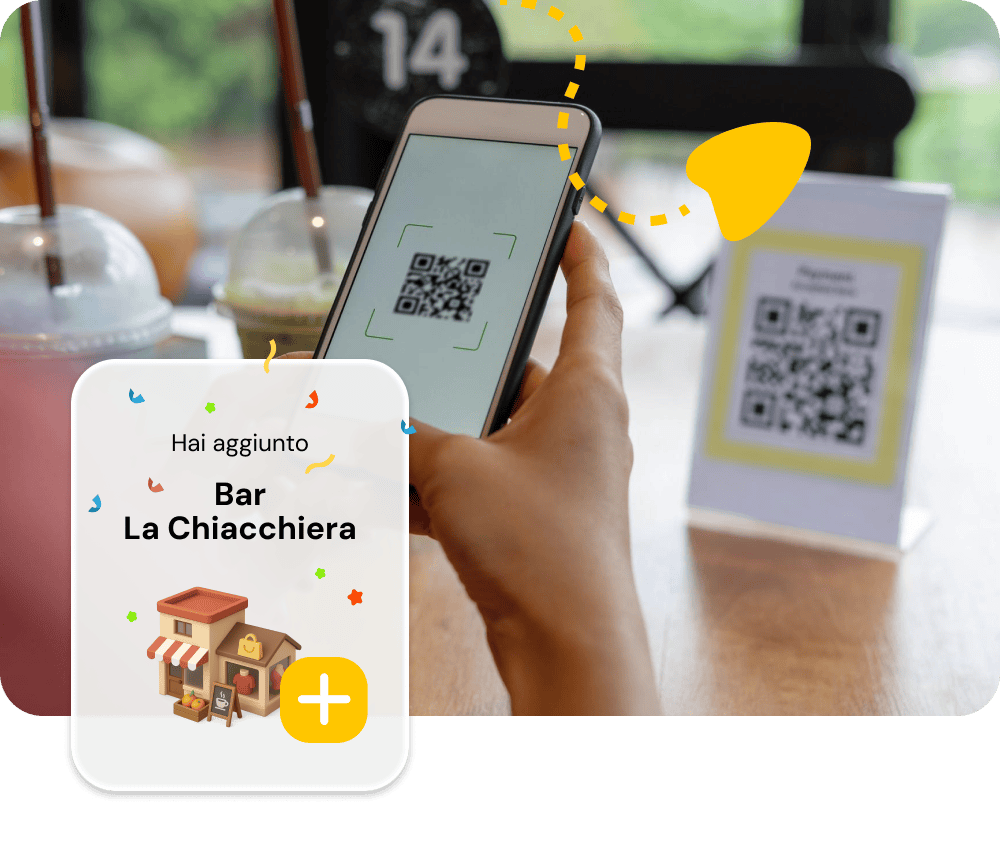 Il cliente ti mostra il suo QR code dall'app. Tu lo scansioni col telefono, inserisci l'importo, e i punti vengono accreditati in automatico. Zero errori, zero calcoli a mente, zero hardware.